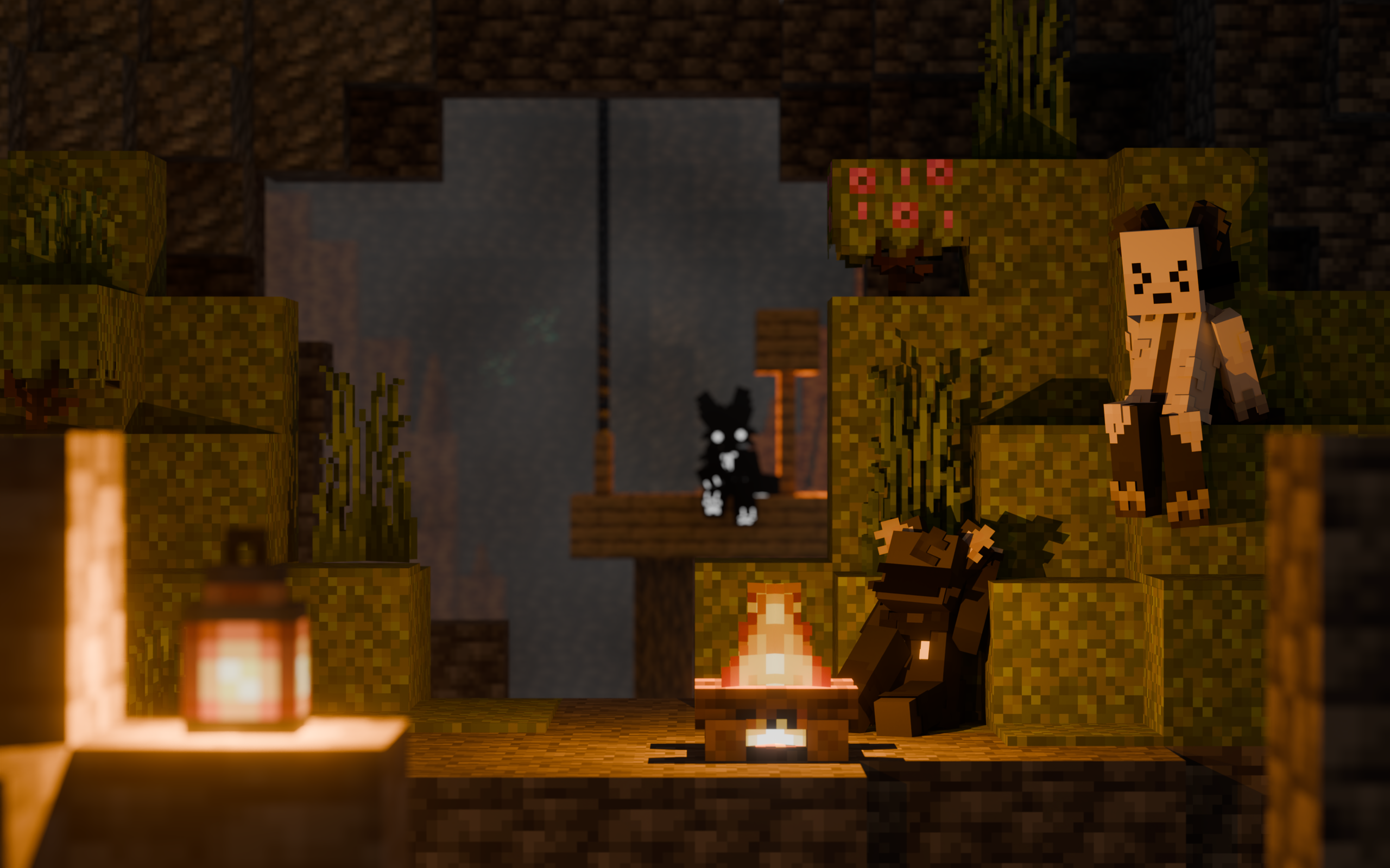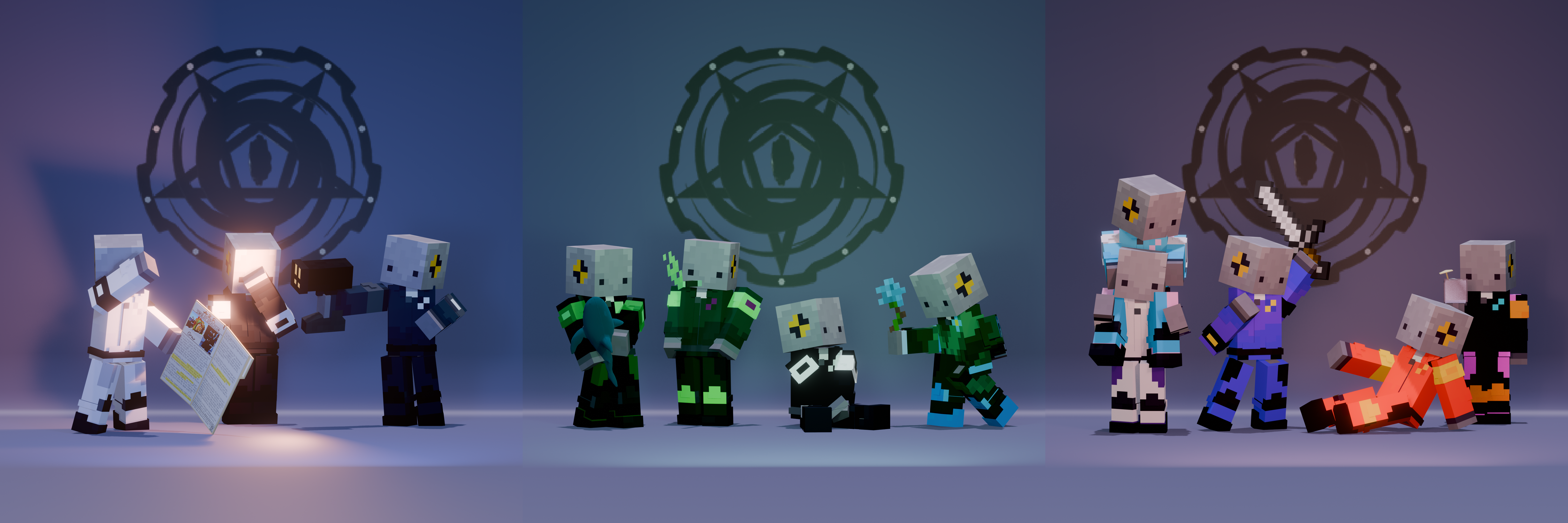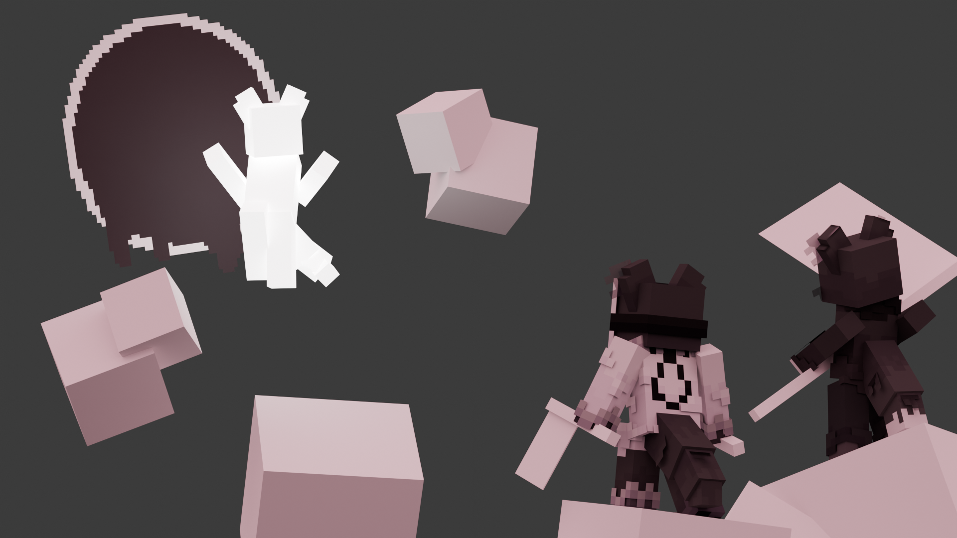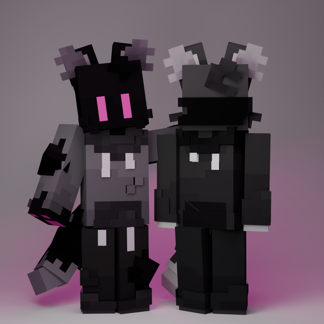 A render made for me to use as a wallpaper. Inkblot was fully modeled by me in Blockbench, while Gray and Specter were built off of default slim skins.